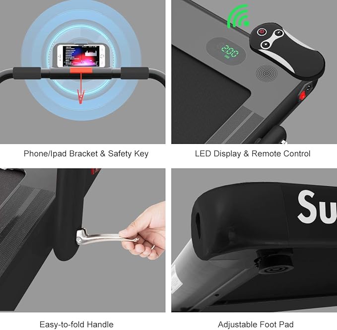 - Spacious Running Belt & LED Display & Phone Bracket: Excellent load-bearing capacity together with the wide and non-slip running area will improve safety during your workout. The LED display helps you clearly see your movement time, speed, distance and calories. Besides, the phone holder allows you to exercise while entertaining.