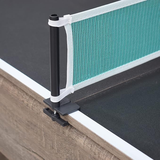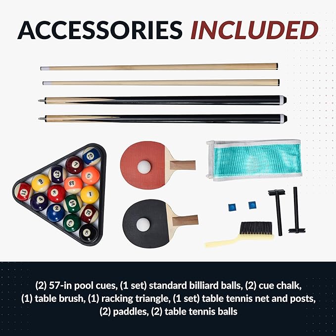 - COMPLETE GAME KIT AND WARRANTY ??Includes pool cues, billiard balls, chalk, triangle, brush, net, paddles, and ping pong balls?”everything you need for both games. Backed by a 180-day limited warranty for peace of mind.