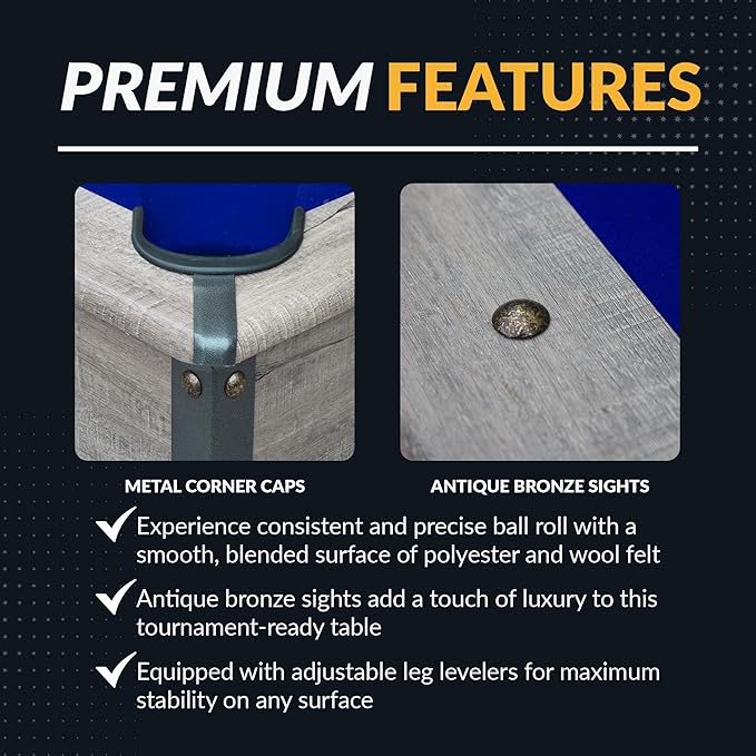 - TOURNAMENT-STYLE PLAYFIELD ??The Logan dining, ping pong, and billiards table combo features blended wool and nylon blue felt, K-66 gum rubber cushions for precision bounce, and antique bronze inlaid sights for perfect shot alignment.