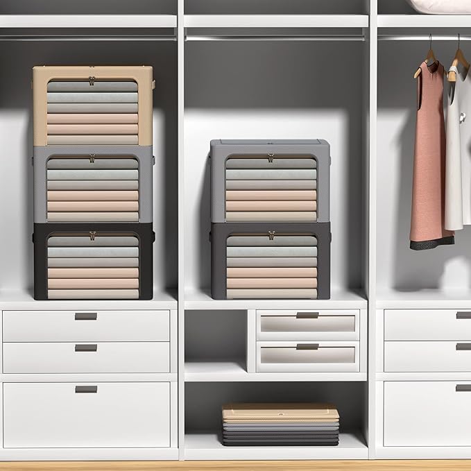 3Pack Frame Storage Box - Clothes Storage Bin Bags Oxford Fabric Foldable Stackable Container Organizer Set with Clear Window & Carry Handles Large Capacity (Grey, Large-66L)