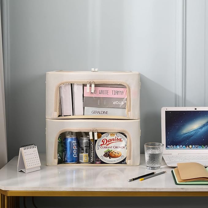 3Pack Frame Storage Box - Clothes Storage Bin Bags Oxford Fabric Foldable Stackable Container Organizer Set with Clear Window & Carry Handles Large Capacity (Beige, Small-22L)