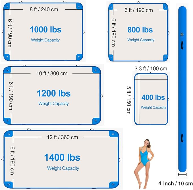 - 【LARGE INFLATABLE PLATFORM】 The inflatable dock serve as a floating resort. Comfortably holds 4 to 6 people and over 1000 lbs of weight. You can add coolers, chairs, and umbrellas to it for swimming, snorkeling, yoga, lake lounging, or tanning.The stainless steel D-rings are designed for quick and easy tethering to any dock, boat, or anchor.