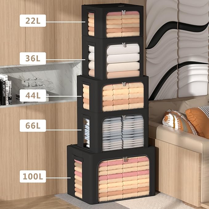 3Pack Frame Storage Box - Clothes Storage Bin Bags Oxford Fabric Foldable Stackable Container Organizer Set with Clear Window & Carry Handles (Black, Small-22L)