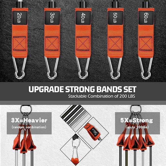 - Adjustable Resistance Bands - These 48-inch exercise bands for working out come in 5 resistance levels(20lbs, 30lbs, 40lbs, 50lbs and 60lbs), each with a distinct color. You can use them individually or combine them for a maximum resistance of 200lbs