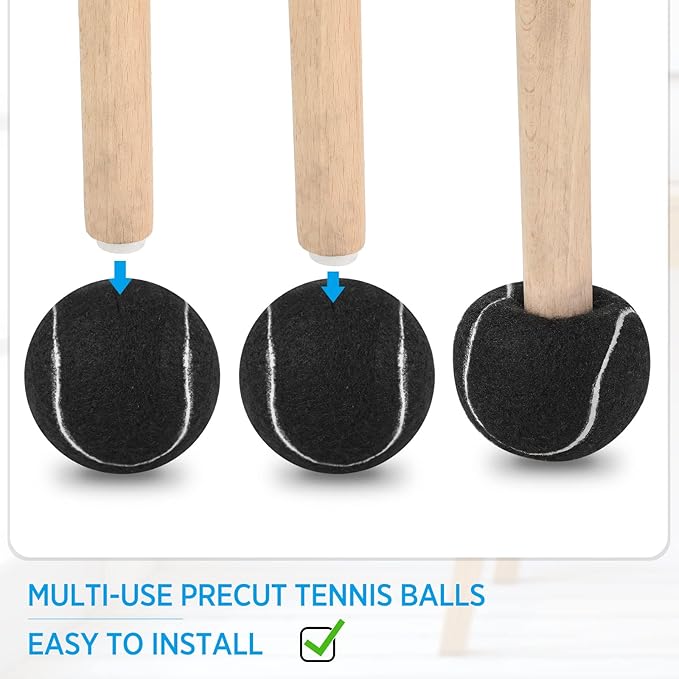 - Almost No Noise at All: use our furniture tennis balls to avoid scratching your wood, laminate, or tile floors by placing them on the legs of your furniture, such as tables, chairs, sofas, and other items; Additionally, that unpleasant scratching noise is no longer necessary