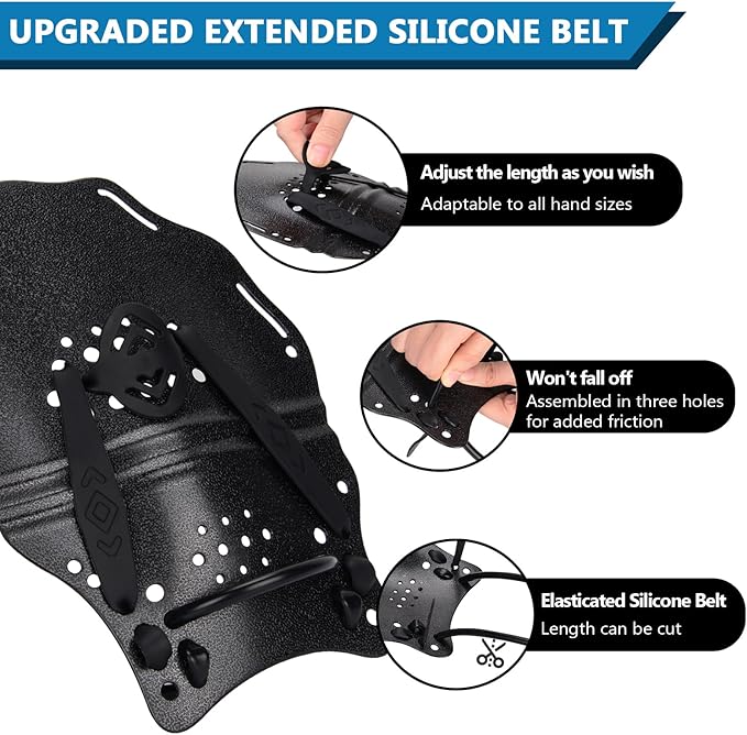 - [OPTIMISED AND IMPROVED] The updated design of the swim paddle hand have been lengthened and we are giving away 2 pairs of long and short wrist straps for you to choose from, eliminating the problem of the wrist straps falling off during swimming and greatly increasing the resistance of swimming.