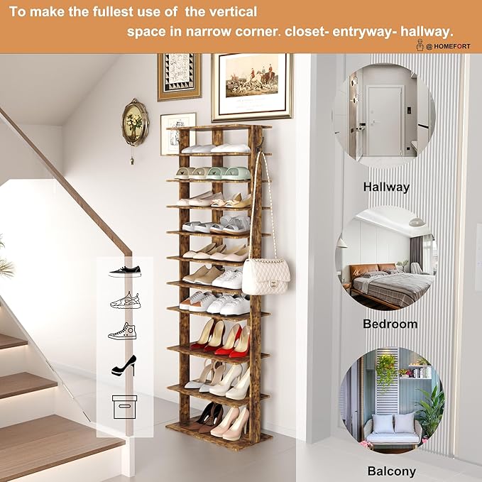 HOMEFORT 10-Tier Vertical Shoe Rack, Corner Shoe Tower, Double Rows 10 Tiers Shoe Shelf, Slim Shoe Storage Unit for 20 Pairs of Shoes, Shoe Stand for Entryway, Hallway, Closet (Rustic Brown)