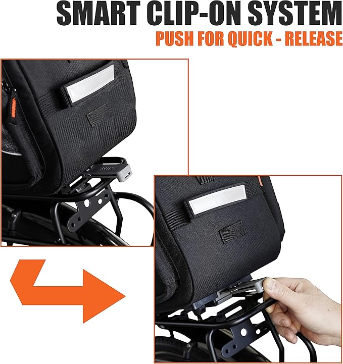 - EFFORTLESS MOUNTING - ONLY FOR MIK RACKS: Smart clip-on system attaches securely to compatible racks in seconds - this bike bags for bicycles rear rack fits tightly without tools or straps.