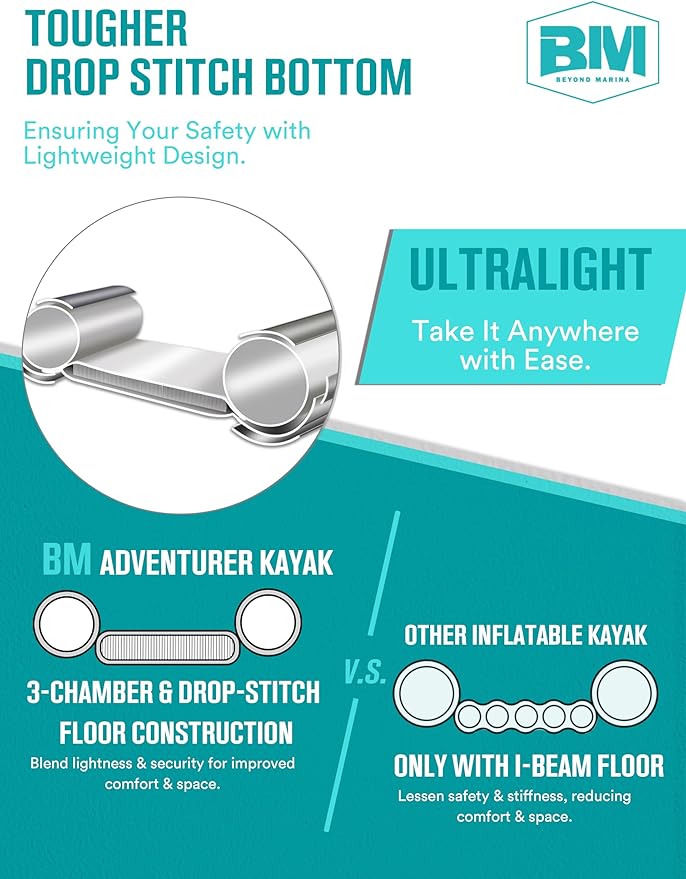 - Portable and Easy to Use: With a high pressure hand pump, the Beyond Marina Inflatable Kayak with Drop Stitch Bottom inflates to a full size kayak in less than 5 minutes, making it perfect for spontaneous adventures. Hull lightweight design at 25.35 lb allows for easy transport and maneuvering.