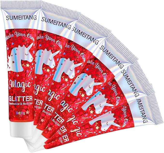 - Stunning Holographic Shades: Elevate your glow with six stunning holographic body glitter gels in White, Silver, Gold, Pink, Blue, and Red. Each shade shifts colors at every angle, creating a mesmerizing, multifaceted shimmer