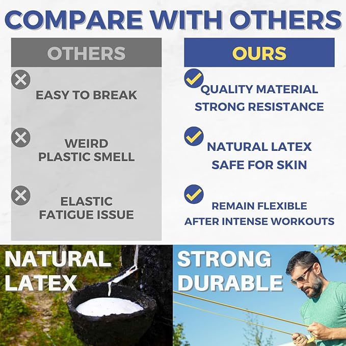 - 【DURABLE AND SAFE】:Our resistance bands are made of natural latex, they are non-irritating and harmless to skin, safe for all level users, due to quality raw material, they are very durable and flexible that can withstand extreme force, give you a big hand when doing intense workouts. Our resistance band can last for years, help you save money from buying others poor band.