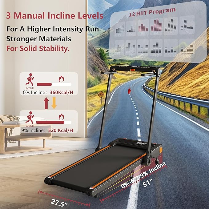 - [3-Level 9% Incline Treadmill] Designed for diverse fitness needs, this walking pad with incline offers 3 manually adjustable levels (0%, 6%, 9%) to simulate flat roads or uphill climbs, helping you burn more calories and engage different muscle groups. With 12 preset programs (P1–P12) that support one-touch workout customization, this portable treadmill adapts to beginner and advanced routines alike—perfect for cardio, weight loss, or daily walking at home
