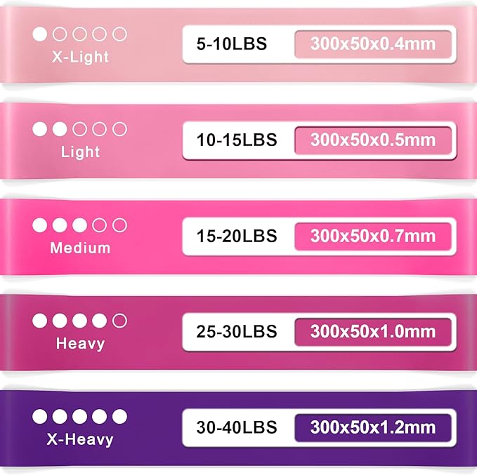 - 5 Level Resistance Band Set:The 5 different colors of the exercise bands different resistance levels and have been optimized and upgraded to increase their thickness compared to the more common resistance bands for legs, with weights ranging from 10lbs to 115lbs when used in combination. Whether you are a beginner or an experienced fitness enthusiast, we have the right weight level for you, which will make this set of fitness band resistance bands your ideal workout companion.
