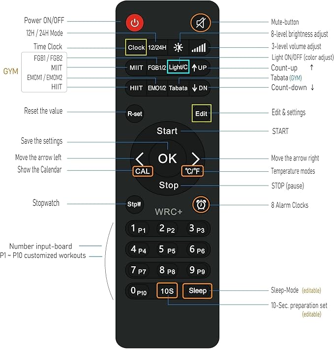 - 【GYM Workout Interval Timers】This Home GYM timer clock has been upgraded in 2024 to satisfied with users’ feedbacks, which can be programed to meet the need of personal interval workouts, including TABATA, EMOM1/EMOM2, FGB1/FGB2, HIIT, MIIT, and WRC+ 10 group customized workouts settings for different users. You can start the workout intervals with its default value by one-button directly, or start it with personal settings, the max cycle is up to 99 rounds for all interval workouts & even for countdown/up, and it will show which round is going when working, and with 10-seconds preparation setting, reminding with buzzer & beep.