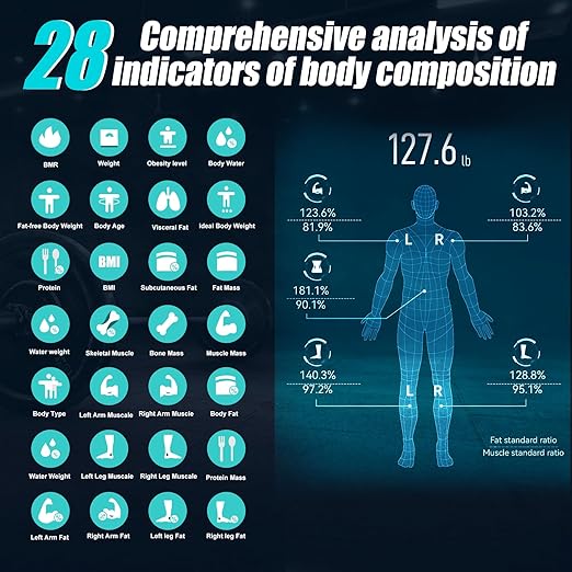 - 28 Body Composition Biometric Analysis: This body composition scale a smart tool for comprehensive body composition analysis. It accurately measures weight, body fat rate, body water rate, muscle mass, bone mass, BMI, bioelectrical impedance, segmental fat and muscle distribution, and more. Providing detailed insights into your body composition and help you track your health and fitness schedule.