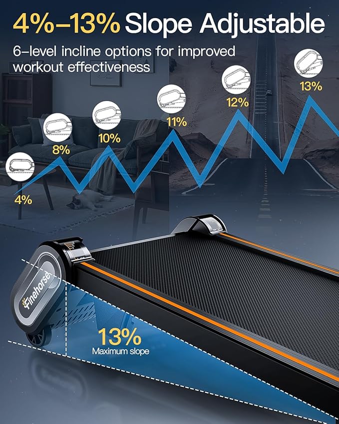 - Treadmill with Auto Incline: Up Pad incline treadmill offers six adjustable incline levels (4%, 8%, 10%, 11%, 12%, 13%), catering to diverse workout and fitness aspirations. It simulates the challenging terrain of mountain climbs, enabling an intense calorie burn that targets and tones your waist and leg lines. Achieve your fitness goals with precision and efficiency, powered by this walking pad treadmill