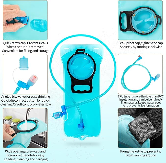 - 【Professional 2L Water Bag】: LASUK Hydration Backpack is an extra large 2L water bag made of TPU material, BPA-free and odorless. The fabric is easy to clean and add ice cubes. The 360-degree rotatable nozzle is convenient for front placement. The on/off valve helps to regulate the water flow. The large capacity of 2L ensures sufficient water supply during a full day of intense hiking/outdoor sports/hunting