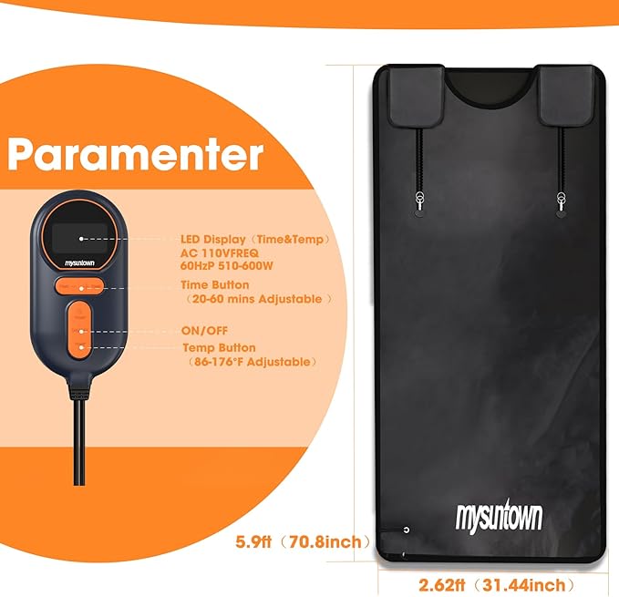 - Tailored Sauna Experience: Create your ideal home sauna session with our advanced sauna blanket. Adjust the temperature from 86°F to 176°F to match your comfort level and select session lengths from 20 to 60 minutes. Enhance your wellness routine and enjoy deep relaxation with this state-of-the-art sauna blanket