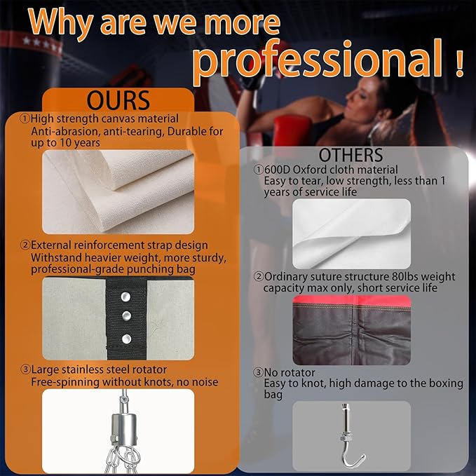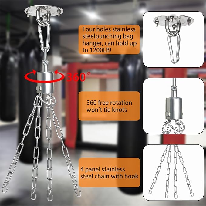 - PUNCH BAG WITH 360ยฐ ROTATING HANGER: Swivel Hanger allows the heavy bag/saco-de-boxeo to rotate freely without knotting after impact. The stainless steel material make it can hold up to 1200LB! Hang the bag indoors or your home rooms and start your boxing training