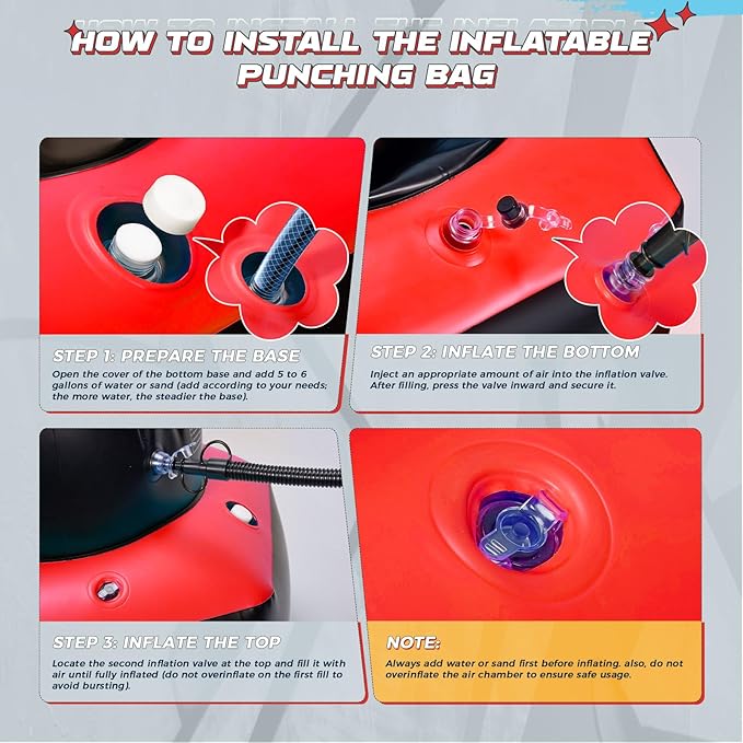 - Easy Setup & Storage: Set up this inflatable punching bag for kids in minutes—just fill the base with water and inflate! The lightweight design of boxing punching bag makes it easy to move and store, ideal for both indoor and outdoor play