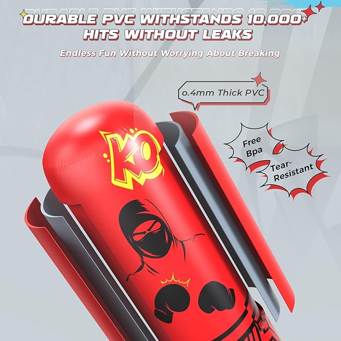 - High-Quality & Safe: Made from high-quality, tear-resistant PVC, this heavy punching bag inflatable withstands up to 10,000 strikes without leaking or deforming, and the material is safe, it offers kids peace of mind for safe play