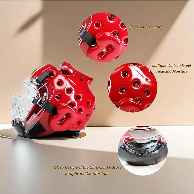 - EAR PROTECTION & VELCRO DESIGN: Ear area is individually designed for protection, which can better cushion the impact and maintain ventilation and normal hearing. It is also available for Taekwondo Karate combat and competition; velcro design of the chin can be more simple and comfortable to put on and take off, as well as adjust the size, for different head shapes.