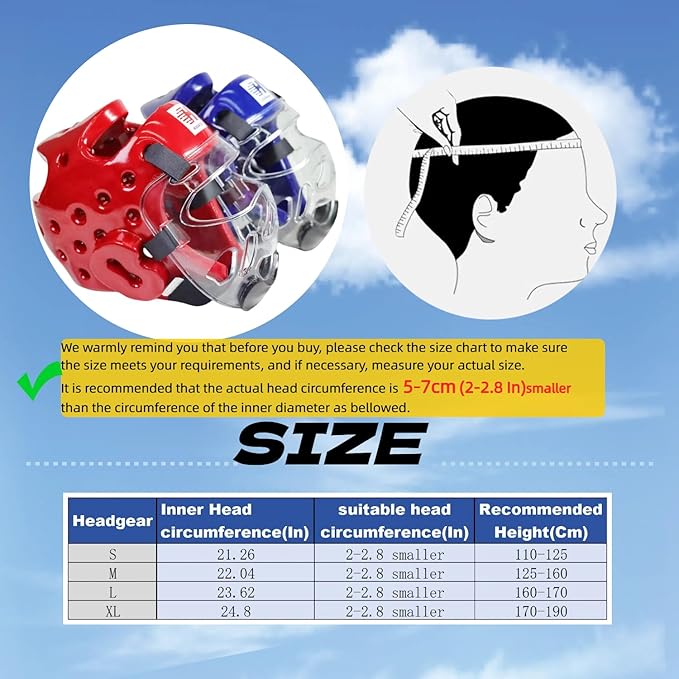 - EXCELLENT PROTECTION: three-quarter inch thickness of the headgear is made of vinyl-covered lightweight NBR dense sponge, which is designed for maximum coverage and breathability for adequate head safety; light-weighted and comfortable, the headgear is an Ideal choice for both Taekwondo Karate beginners and professionals.