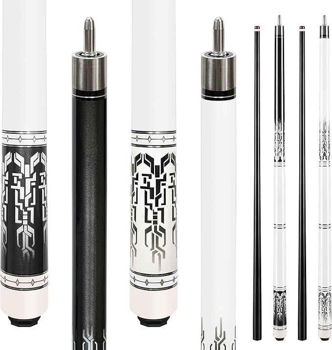 - ?�Premium Material?? Pool cue black section made of glass fiber, backend is made of Canadian maple wood maple wood, finished with matte paint. Features a two-piece pool cue stick design for easy transport and storage.