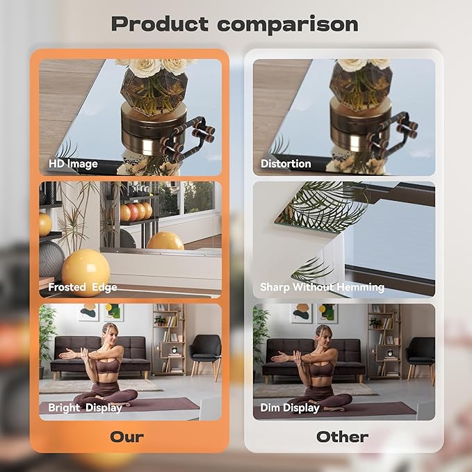 - π§[After-sales Service] We have more than 20 years of experience in glass production, and we guarantee that the fitness mirrors you receive are thoroughly quality guaranteed. Mirrors are fragile and collisions are inevitable during transportation. If you find any problems or any parts are missing when you receive the mirror, please contact us in time. We will solve the problem for you as soon as possible.