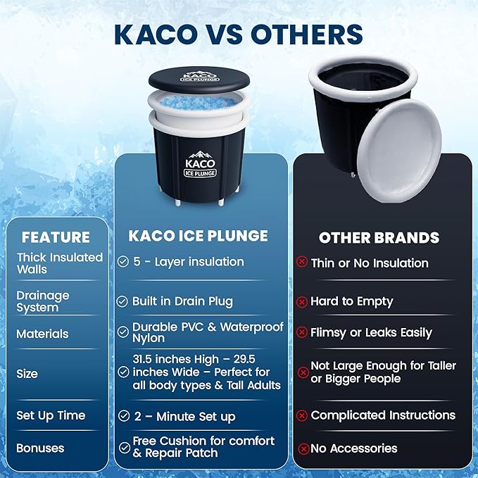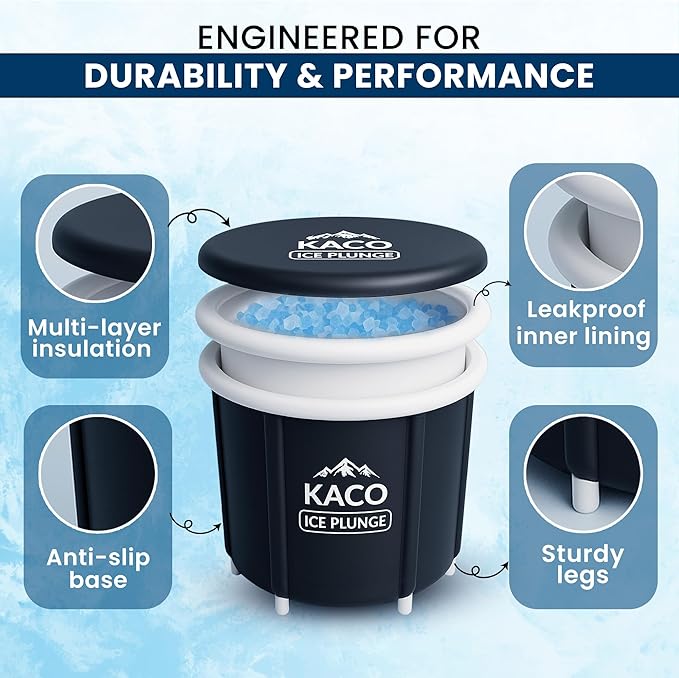 - Cold Water Therapy Supports muscle recovery, reduces inflammation, and improves circulation. Ideal for athletes and wellness. 100-Gallon Capacity Fits adults for full-body immersion. Great for home gyms, saunas, or outdoor recovery. Durable & Leakproof Made from PVC with multi-layer insulation to hold cold longer and prevent leaks. Easy Setup Tool-free, portable design. Quick to assemble, drain, and store. Indoor & Outdoor Use Suitable for use year-round, inside or outside, in all weather.