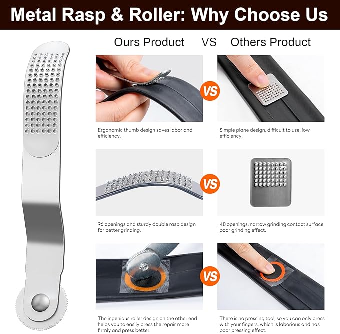 - MULTIFUNCTIONAL METAL FILE: Helps you to grind the broken part of inner tire. On the other end of the file is a cleverly designed double roller, which helps you to easily press the repair more firmly and with more pressure. The ergonomic design fits comfortably in your thumb, ensuring easy and efficient operation. this is something most kits leave out