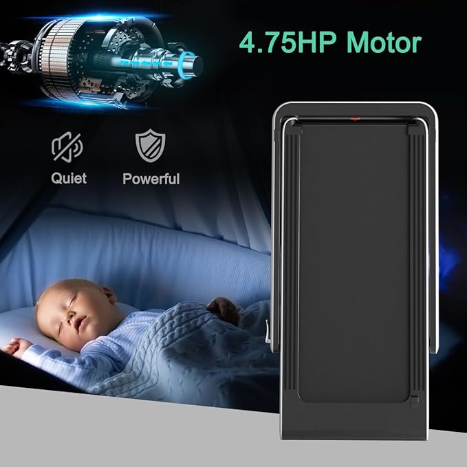 - ๐๐ผ๐๐ฏ๐น๐ฒ ๐ฆ๐ต๐ผ๐ฐ๐ธ ๐๐ฏ๐๐ผ๐ฟ๐ฝ๐๐ถ๐ผ๐ป ๐ฆ๐๐๐๐ฒ๐บ: Equipped with damping and silicone diamond systems, this under desk treadmill with 5-layer shockproof and anti-slip running belt offers better protection for knees and joints. In Addition, the 4.75hp powerful motor ensures a quiet and smooth running. Please do not use the treadmill on carpet to avoid overheating.