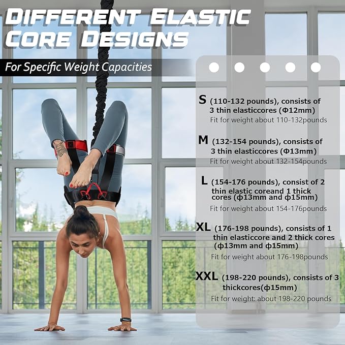 - Comfortable & Adjustable Harness System – The padded waist belt (fits up to 45") and thigh straps (up to 31") provide a secure yet comfortable fit. Includes 1* Harness,1* Bungee Cord,2 daisy chains, 3 heavy-duty carabiners(2 already installed, and another one), and an illustrated workout guide for easy setup.