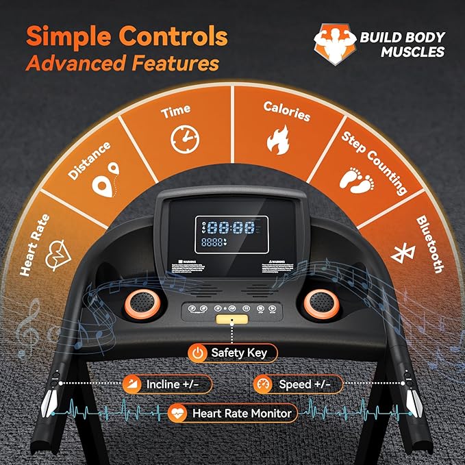 - 【Heart Rate Monitoring & Bluetooth APP】 Pairs quickly and maintains stable connection with fitness apps. Syncs seamlessly with major platforms to provide real-time heart rate tracking, optimizing HIIT and endurance training performance. Enjoy one-tap Bluetooth pairing and immersive music for your run on this walking pad treadmill.