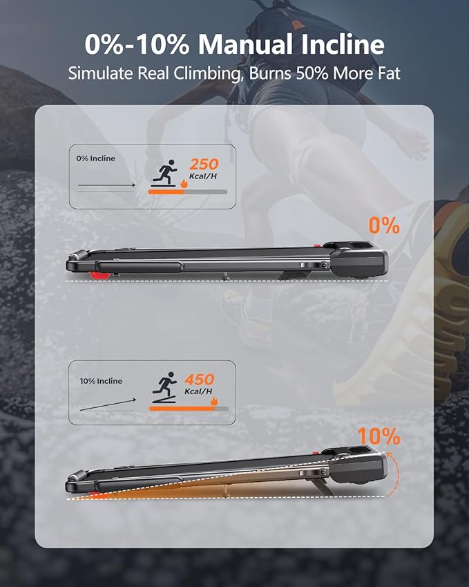 - 【Up to 10% Manual Incline + Shock Absorption】 Crank up the intensity with a 0-10% manually adjustable incline that mimics real uphill terrain and burns 30% more calories.Keep your exercise plan whatever the weather. Plus, our double shock absorption system (rear rubber dampers + 8-point side cushioning) and 7-layer anti-slip belt protect your knees and ankles from hurting while keeping your workouts quiet.