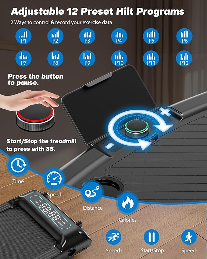 - 12 Preset Hit Program : Stay fit and stay healthy with this under desk treadmill, you can choose at will from 12 preset modes which offer varying speeds to fit different fitness routine. Data Display allows to track in speed, distance, time and calories burned. Whatever most family members, sedentary office workers, seniors who need exercise, the foldable treadmill for home office can allow you to improve your mental health, reduce stress from beginners to pros.