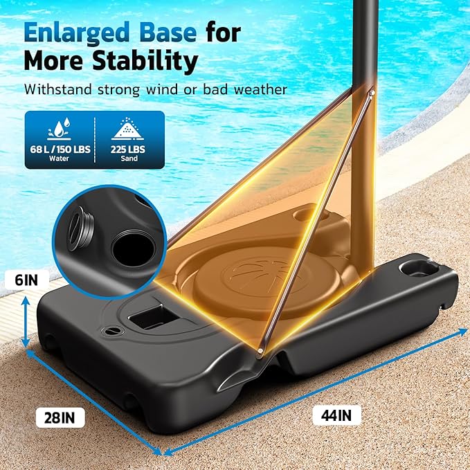 - Heavy-Duty Base Tank: Basketball goal with 20% bigger base - holds up to 68L/150LBS of water or 225LBS of sand. The extra size and weight dramatically boost stability, safety, and long-term performance of the basketball goal.