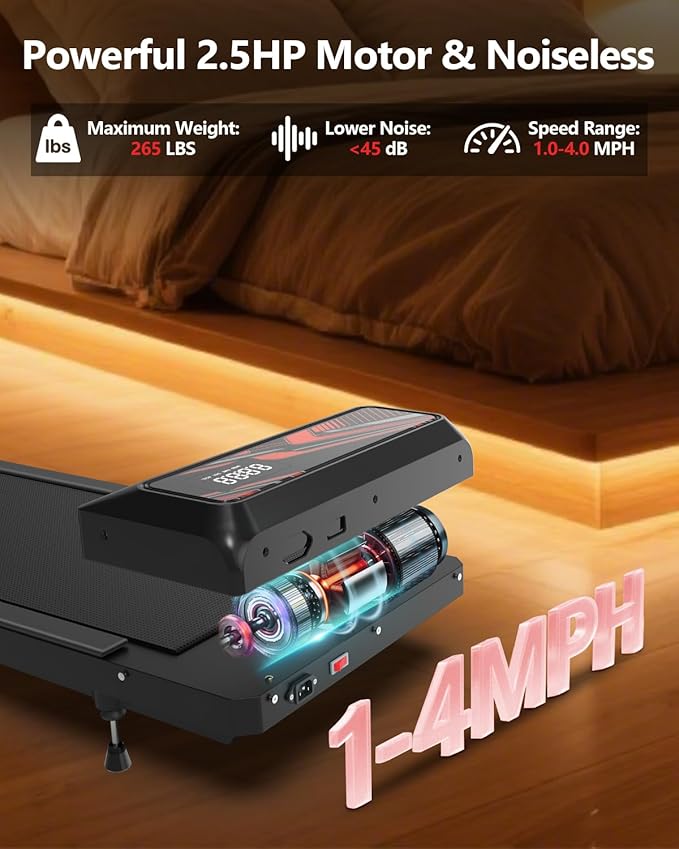 - 【Silent Operation(<45dB)】This HCOIW mini treadmill packs a 2.5HP powerhouse that runs quieter than a library (<45dB). Cruise from a chill walk (1 MPH) to a solid jog (3MPH) without waking the neighbors. Holds up to 265lbs -You can switch between walking and running freely, meeting all your needs from daily walking to jogging.