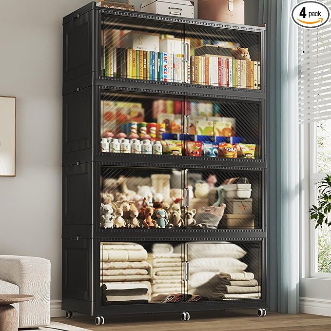 - 【10x Support Rods & 6x Rotating Wheels】Each 4-layer storage cabinet has 5x2 full metal support rods embedded in the bottom and lid. The more heavy-duty foldable storage bins can bear up to 180-220lb, far exceeding other fragile plastic folding storage bins. The wheeled storage bins design with 6x 360-degree rotating wheels, allowing for easy movement.WARNING : CHOKING HAZARD-small parts. Not for children under 36 moths.