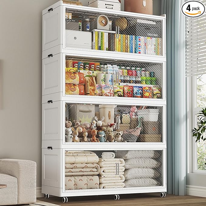 - 【10x Support Rods & 6x Rotating Wheels】Each 4-layer storage cabinet has 5x2 full metal support rods embedded in the bottom and lid. The more heavy-duty foldable storage bins can bear up to 180-220lb, far exceeding other fragile plastic folding storage bins. The wheeled storage bins design with 6x 360-degree rotating wheels, allowing for easy movement.WARNING : CHOKING HAZARD-small parts. Not for children under 36 moths.