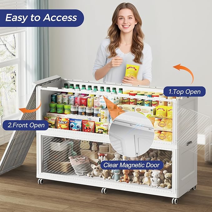 - 【Two Ways to Open & Magnetic Doors】The collapsible storage bins with lids and wheels feature a dual access way, allowing for both top and front door openings, and with clear brown windows for easy visibility. The super huge storage bins with open front doors are equipped with magnetic lock buckles to prevent dust from entering the cabinet.